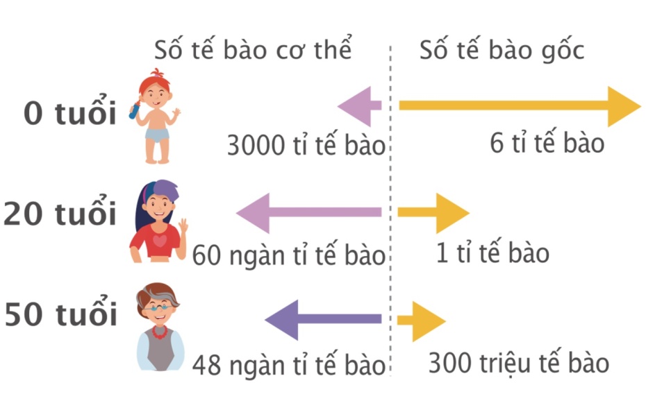 Trẻ sơ sinh có rất nhiều tế bào gốc, các tế bào gốc đó sẽ sinh trưởng và thay đổi thành tế bào soma. Khi trưởng thành, các tế bào gốc sẽ giảm dần theo tuổi tác, và sẽ không chuyển hóa tế bào soma của cơ thể. Nếu bổ sung các tế bào gốc (bằng việc nuôi cấy tế bào gốc tự thân hay tế bào gốc dây rốn phù hợp) thì sẽ ngăn chặn được sự giảm thiểu tế bào.