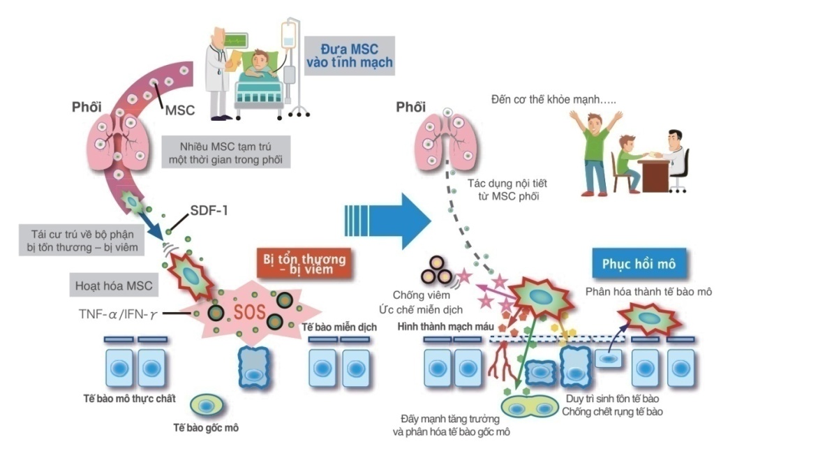 Các tế bào gốc khi được sử dụng điều trị sẽ lưu thông tuần hoàn trong cơ thể, xác định vị trí mô tổn thương và tự kích hoạt cơ chế thay thế – tái tạo – sửa chữa. Điều trị tế bào gốc đem lại hy vọng giảm thiểu được các nguy cơ phát sinh và hỗ trợ điều trị các bệnh như ung thư, đột quỵ, cao huyết áp, bệnh tiểu đường, Parkinson, bệnh xương khớp hay các bệnh do lão hóa... Ngoài ra tế bào gốc còn giúp tăng cường thể lực và hệ miễn dịch cho bệnh nhân ung thư đủ thể lực để tham gia các bước điều trị phẫu thuật, xạ trị, hóa trị.., giúp hồi phục thể lực nhanh chóng sau phẫu thuật cắt bỏ khối u cũng như giai đoạn hồi phục sau điều trị ung thư.
